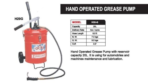 Description 20L Hand Operated Grease Pump Capacity 20L Air Inlet Pressure N/A Fluid Output Pressure N/A Press Ratio N/A Hose Length 1/4″ x 6 Ft Net Weight 7.0 Kg Gross Weight 9.0 Kg