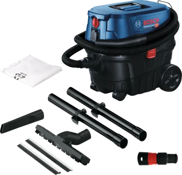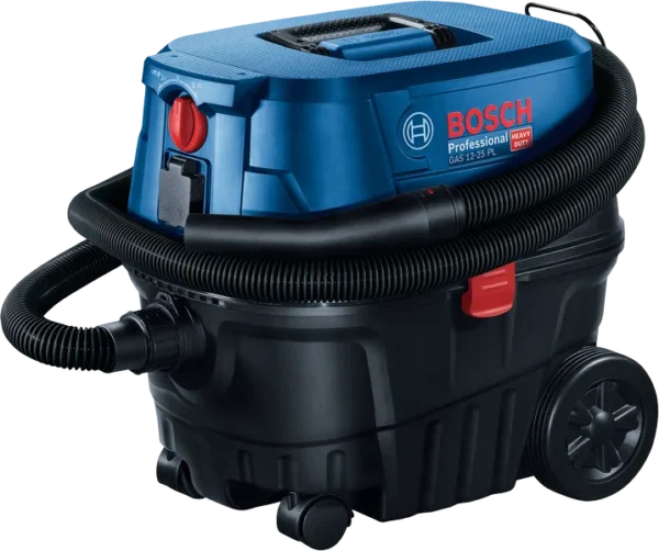 The GAS 12-25 PL Professional is a certified L-class dust extractor. This vacuum cleaner’s powerful 1,250 W motor delivers high suction power for wet and dry applications. With an airflow of 65 l/s and a vacuum pressure of 200 mbar at your disposal, this is a highly efficient device that keeps your workplace clean and dust-free. Thanks to the semi-automatic filter cleaning (SFC) system, cleaning the filter is quick and simple. Plus, the dust extractor comes with a Click & Clean interface so you can effortlessly and seamlessly connect the device to Bosch power tools.