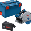 This tool is intended for format cutting and plunge cutting in wood, wood composites, board and panel materials, aluminium, and acrylic glass. It can be used with dust bags and is compatible with the Bosch Click & Clean dust extraction system as well as the Bosch, Festool, Mafell, and Makita guide rail systems and with all Bosch Professional 18 V batteries and chargers (Professional 18V System). Maximum power with ProCORE18V = 8.0 Ah.