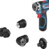 - Bosch FlexiClick interface with integrated magnetic bit holder enables attachment of a bit holder, a chuck adapter, an angle adapter and an offset angle adapter