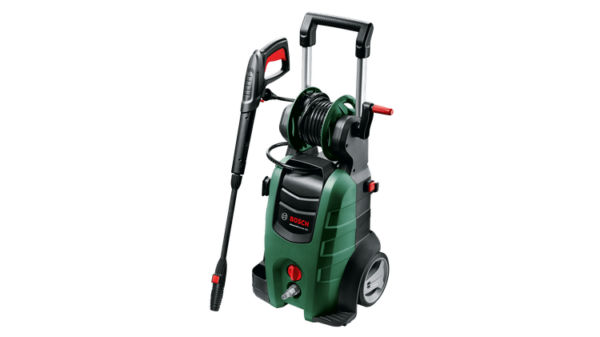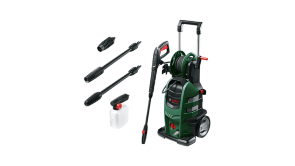- Powerful 150-bar cleaning performance Selection of nozzles offers versatile cleaning options, perfect for stubborn dirt 550-ml High-Pressure Detergent Nozzle saves time by applying soap quickly Easy set-up due to high-pressure hose reel and push-fit connections Metal telescopic handle and large wheels for greater mobility