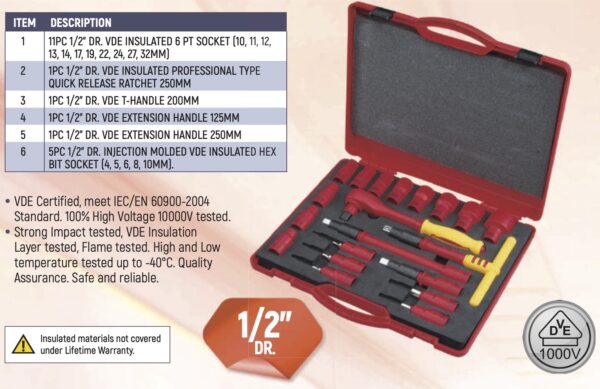 SATA 09267 is a 20pcs VDE insulated socket set with Dr. 1/2″. It is VDE certified, meets IEC/EN 60900-2004 standard.
