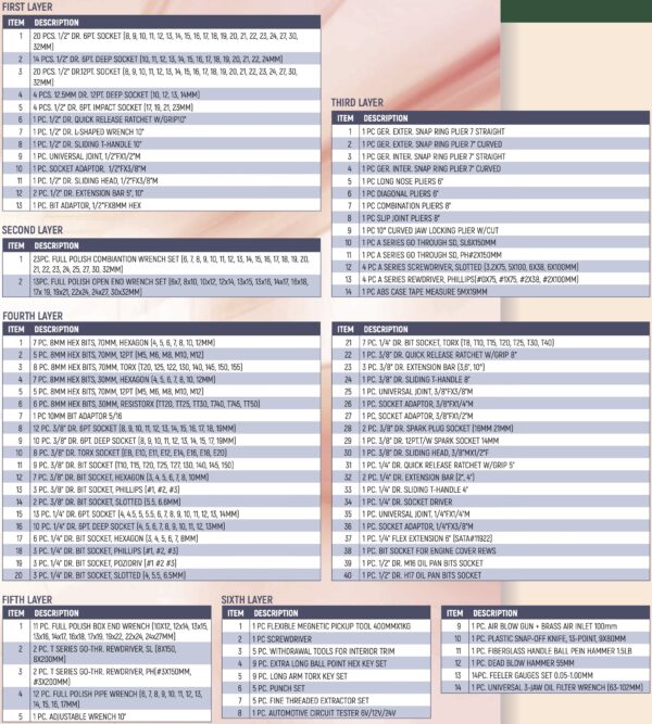 SATA 95107P15B-25BL is a 7 drawers tool trolley set with 368pc tools.