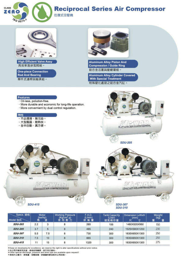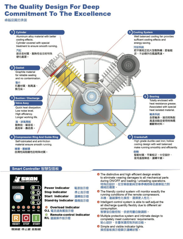 - The SWAN exclusive patented oil free air compressor body, the real oil Oilless structural design, Oil-free clean compressed air, greatly reduce the cost of the Clean Air System, To provide better air quality.