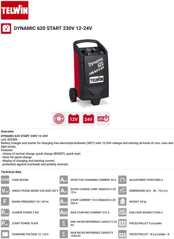 Telwin Dynamic620 Start is a battery charger for charging free electrolyte batteries (WET) with 12/24V voltage.