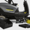 TECHNICAL DESCRIPTION: Drive: – 24 V/750 W DC motor – 1 pedal for forward and reverse – small turning radius (3350 mm) – automatic parking brake with vacuum technology – automatic engine cut out when driver leaves seat – effective round filter system with automatic filter cleaning Sweeping/vacuum system: This machine uses the overthrow principle. In other words, the roller brush throws the dirt up and back into the dirt container. The floating roller brush adjusts automatically to uneven surfaces. The filter and roller brush can be replaced without tools. With integrated coarse dirt flap for coarse waste, e.g. cans, split, gravel or wet leaves. The side brush and roller brush are hydraulically driven. A second optional side brush is available. Dirt container: Both 50 litre dirt containers can be removed from the side. Operation: The main roller brush and side brush can be automatically lifted and lowered via a switch. Forward and reverse via one pedal.
